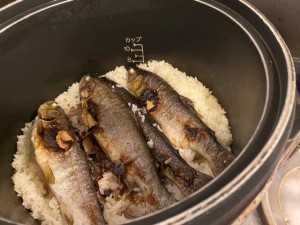 一度塩焼きにしてから白米と一緒に炊き上げました、ご飯に川魚の風味が移って、しみじみ美味しい逸品です。