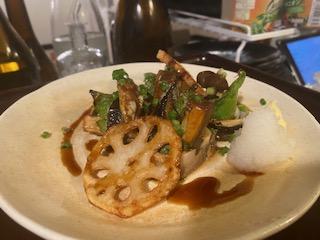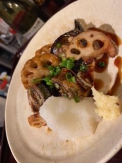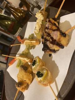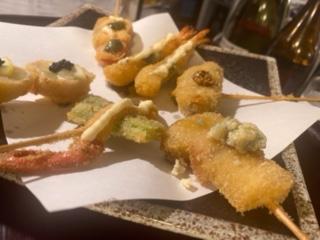 秋の串揚げの「さつまいもベーコンブルーチーズ」にハスネファームさんのハチミツをかけて仕上げてます,是非召し上がってみてください。