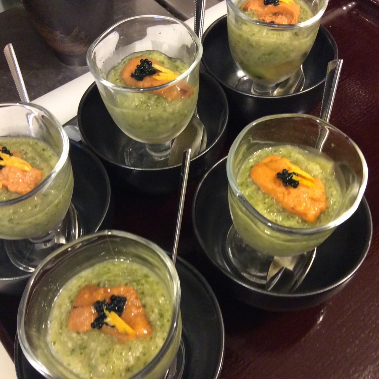 こちらは本日のお通しの「夏野菜のすり流し 雲丹のせ」です。
