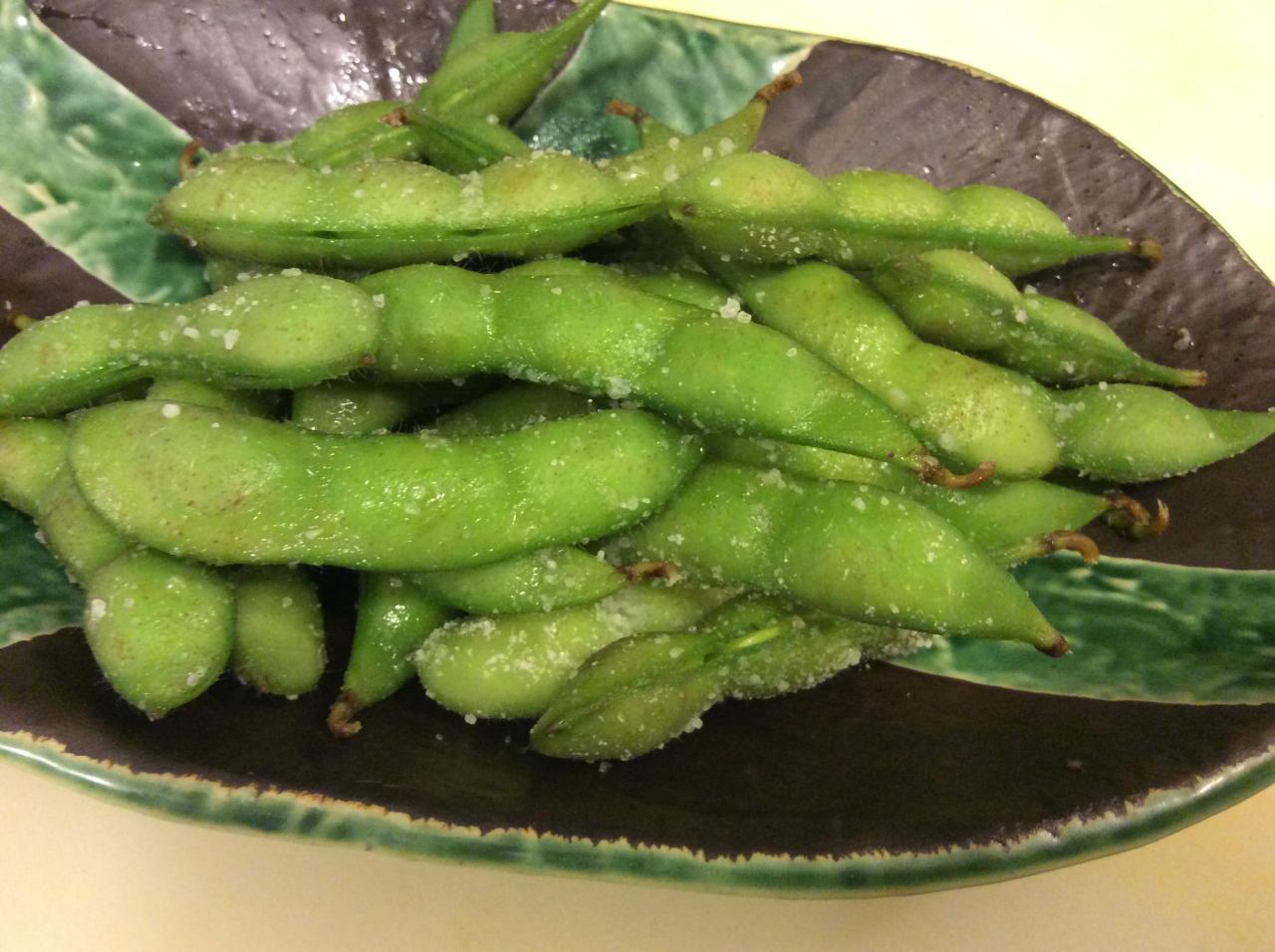 写真は「国産枝豆の塩茹で」です。茹でたてに美味しい岩塩をかけて提供いたします。