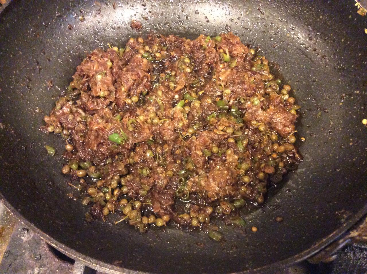 青唐辛子、山椒、かつお節の佃煮をソーセージ種に混ぜ合わせ、いつものソーセージより太い