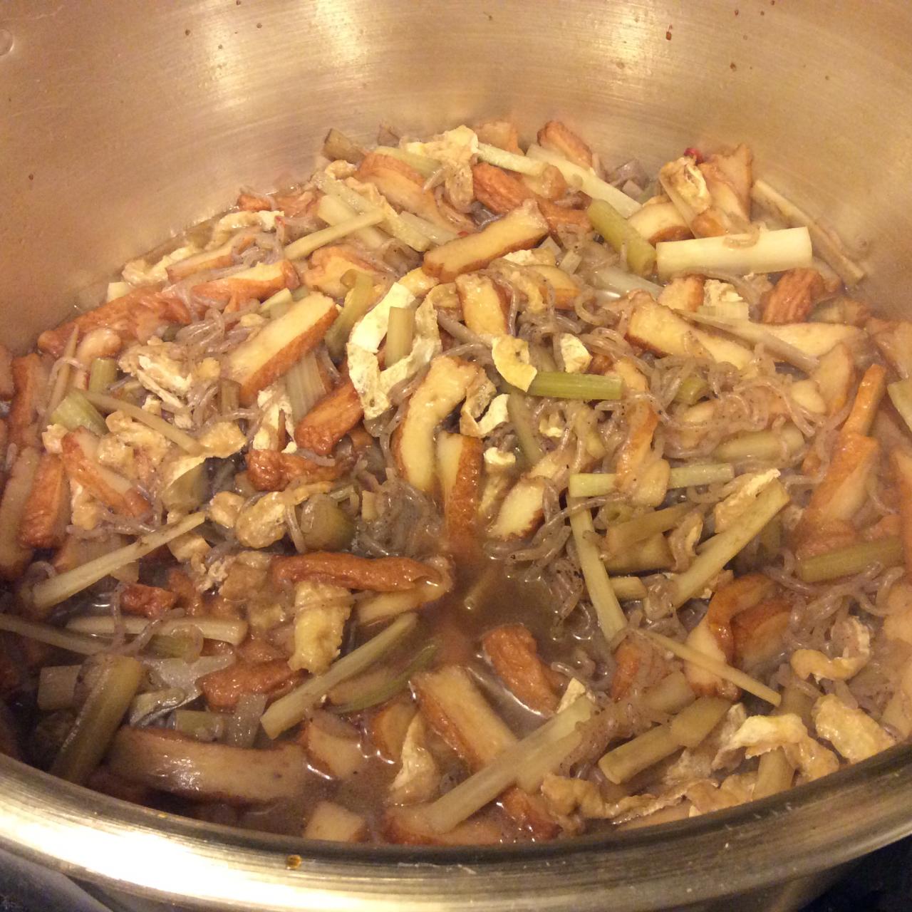 フキとウドの炒め煮です。さつま揚げやこんにゃくと一緒に甘辛く煮付けます。