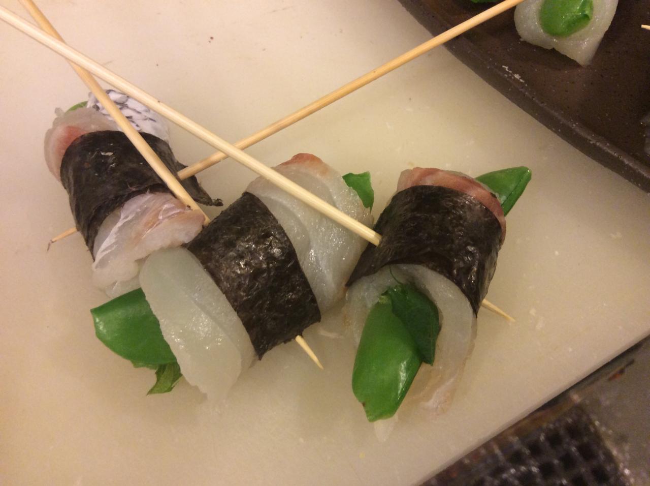 串揚げおすすめは真鯛と「スナップエンドウの磯辺巻き 梅おろし添え」