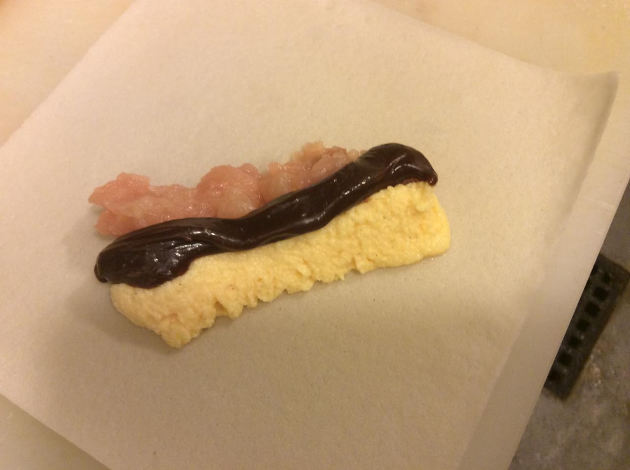 カスタードクリームとカラメルショコラソースと一緒に春巻きの皮に包んで