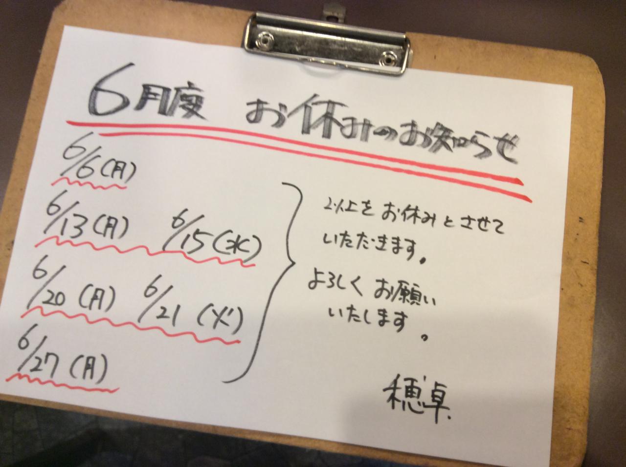 6月度お休みお知らせです。 板橋本町 居酒屋 穂卓
