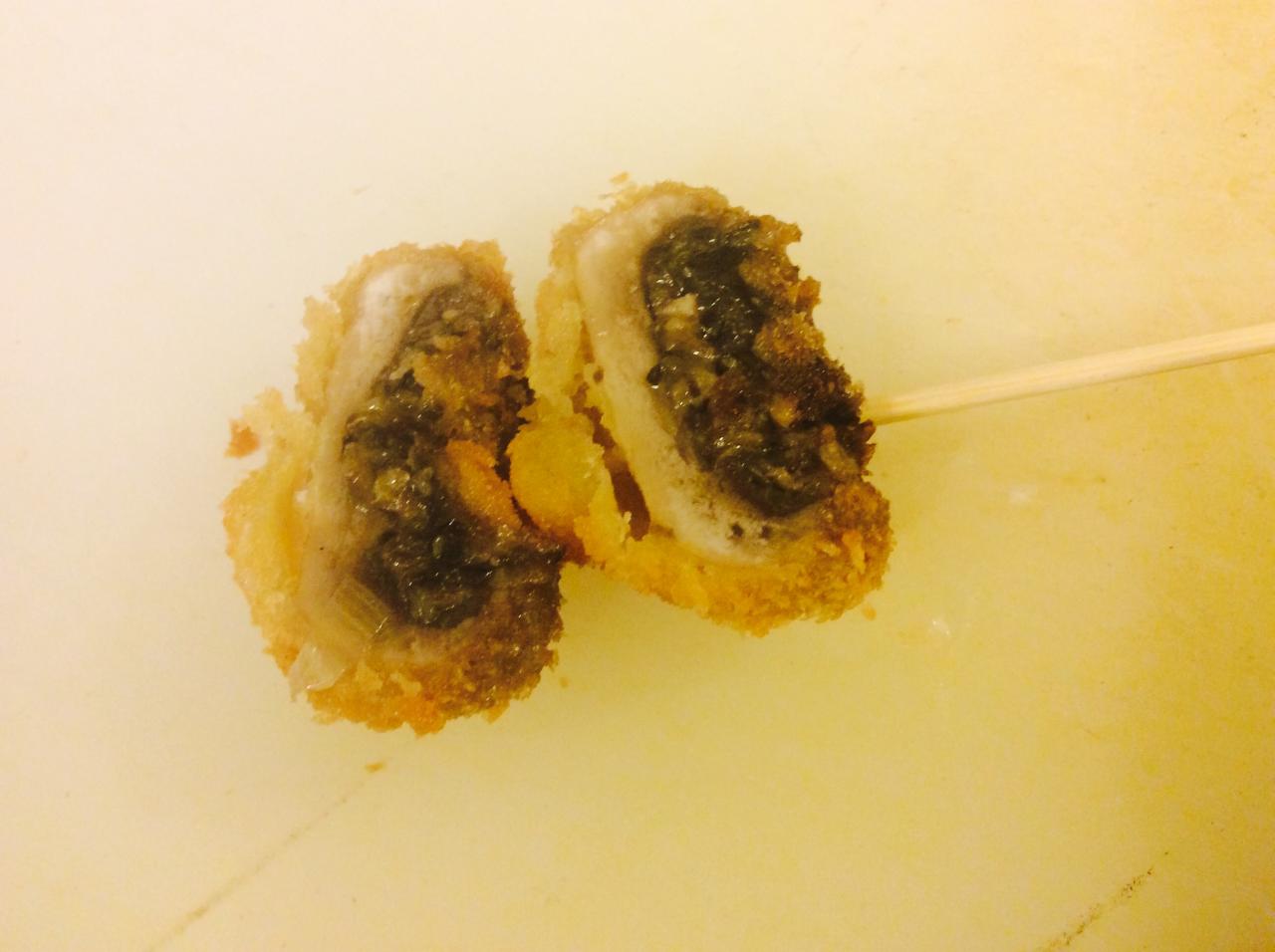 肉厚のマッシュルームにオリーブペーストとネギ味噌を合わせたものを詰めて串揚げにしました!詰め物のペーストは洋風のような和風のような面白い味わいです。