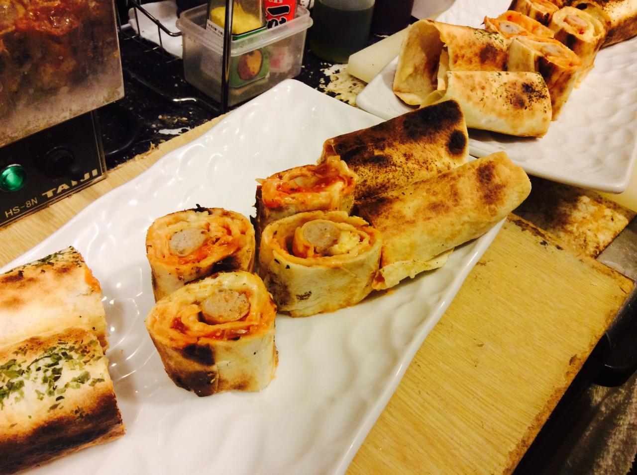 お店で仕込んでいる十四豚のソーセージやトルティーヤ、サルサソース、チーズを巻いて焼き上げた