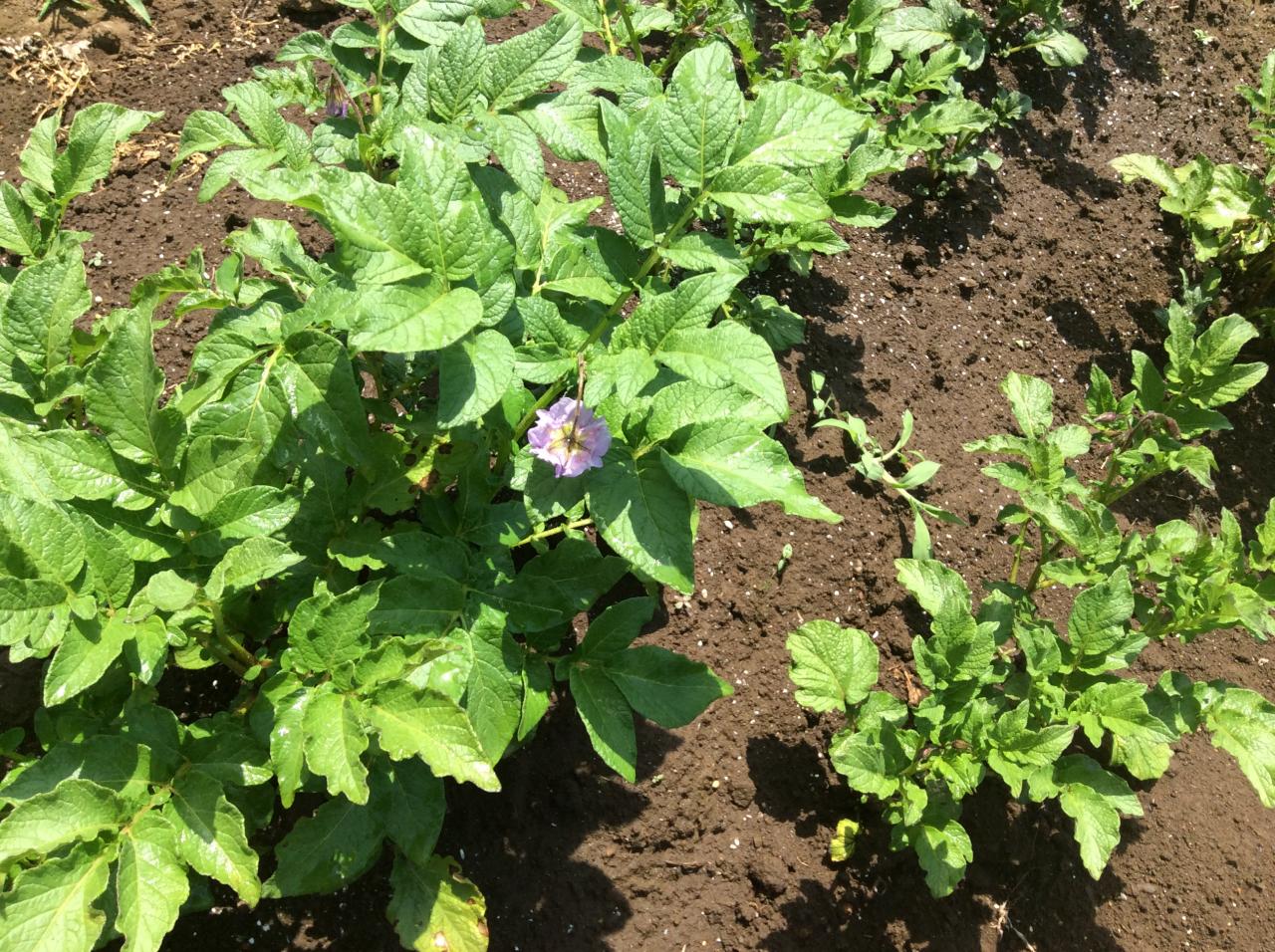 ジャガイモ(インカのめざめ)は花が咲いてきました。綺麗なムラサキ色ですね