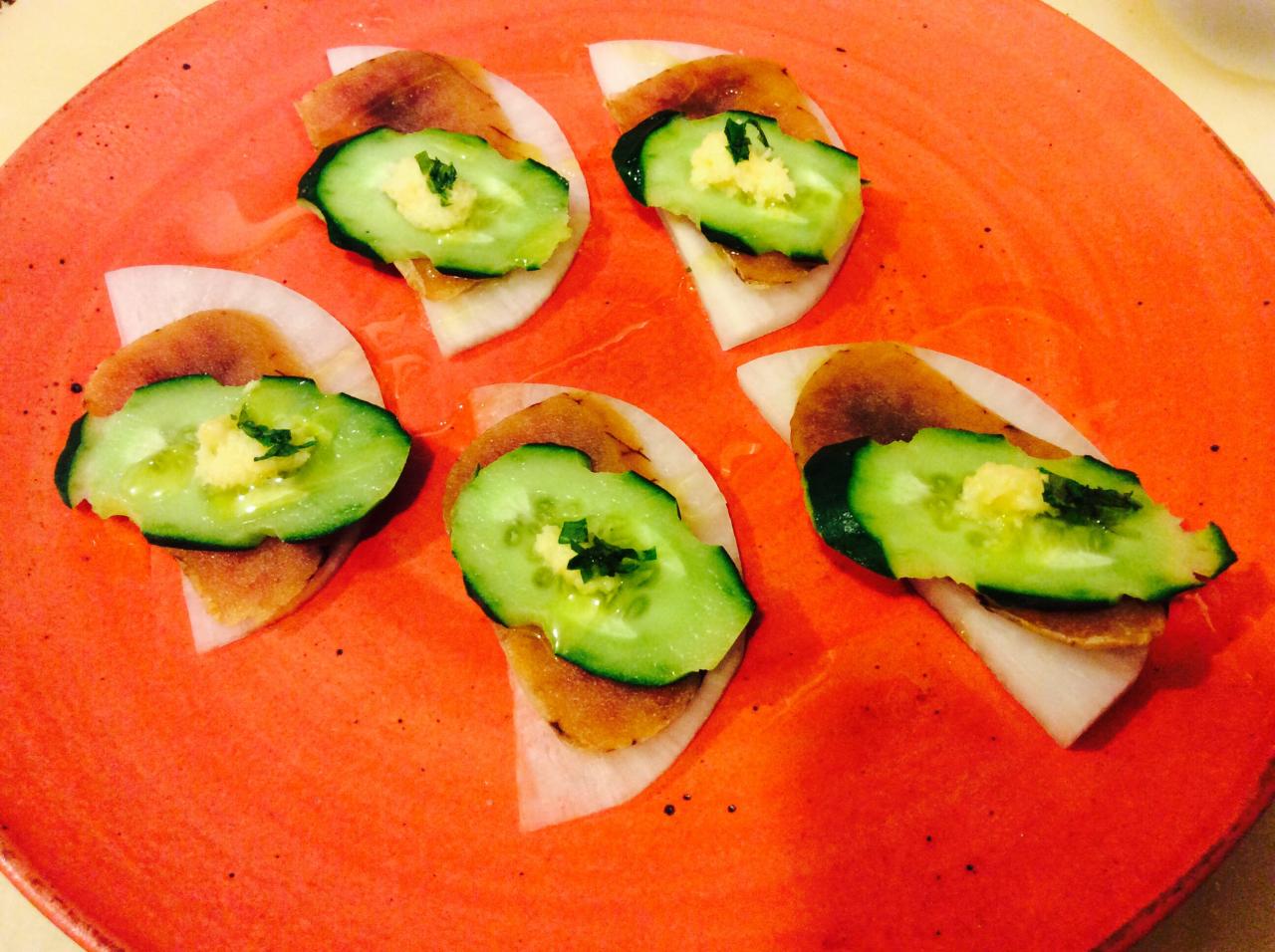 こちらの写真は自家製カラスミの出来上がり、大根と胡瓜でサンドして提供です。