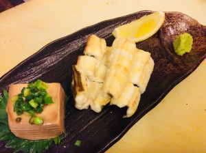 香ばしく炙った穴子と穴子のツメダレで煮込んだ豆腐を添えてご提供です、