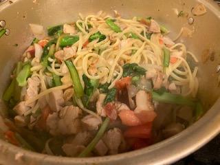 スモークチキンとハスネファーム野菜のペペロンチーノ500円